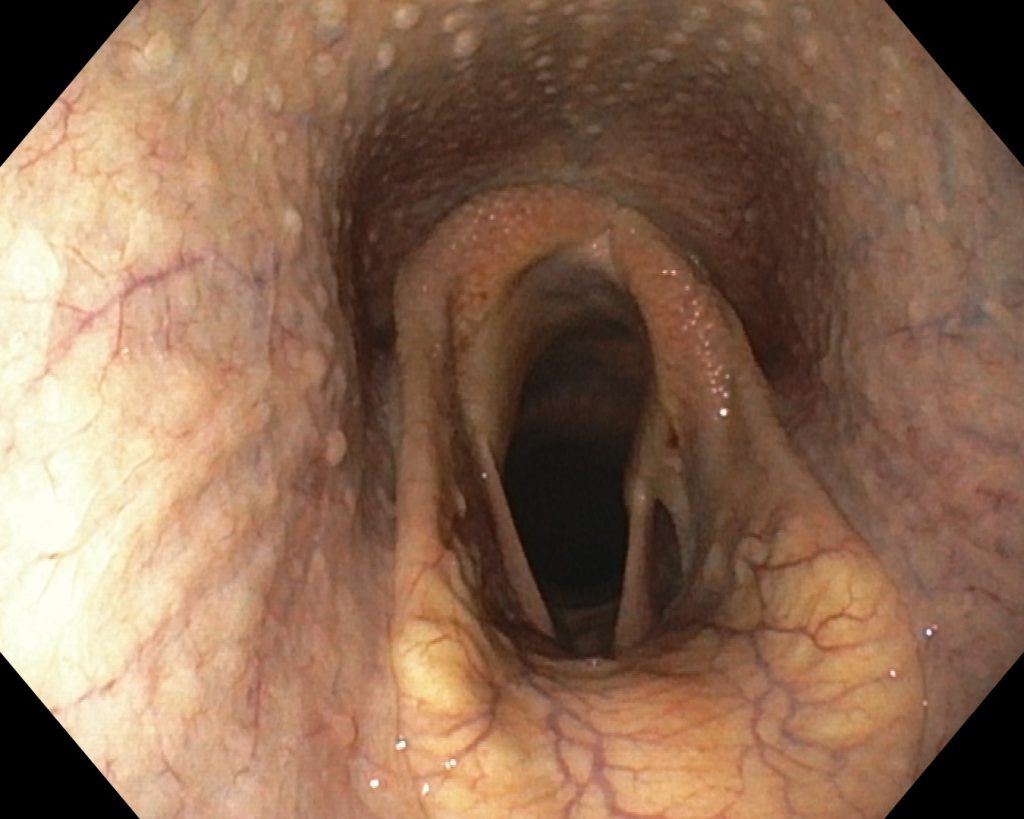 術後1週間の内視鏡。 右の披裂軟骨は呼吸に合わせて閉じたり開いたりしますが、左の披裂軟骨は常に開いた状態です。