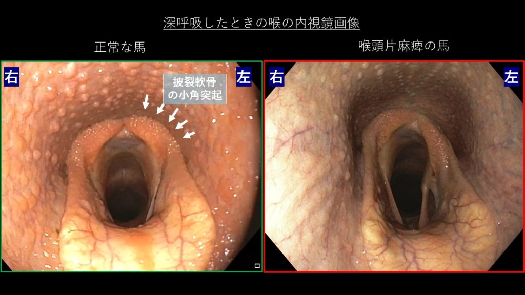 このとき、喉頭片麻痺の馬は 片側の披裂(ひれつ)軟骨の『小角突起』と呼ばれる部位を開くことができません。(図参照)
