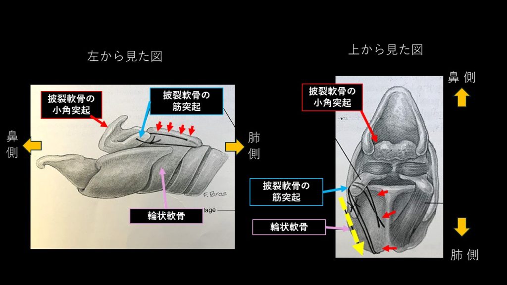 このとき、喉頭片麻痺の馬は 片側の披裂(ひれつ)軟骨の『小角突起』と呼ばれる部位を開くことができません。(図参照)