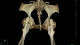 CT ボリュームレンダリング画像 右股関節の背側に骨折線があります